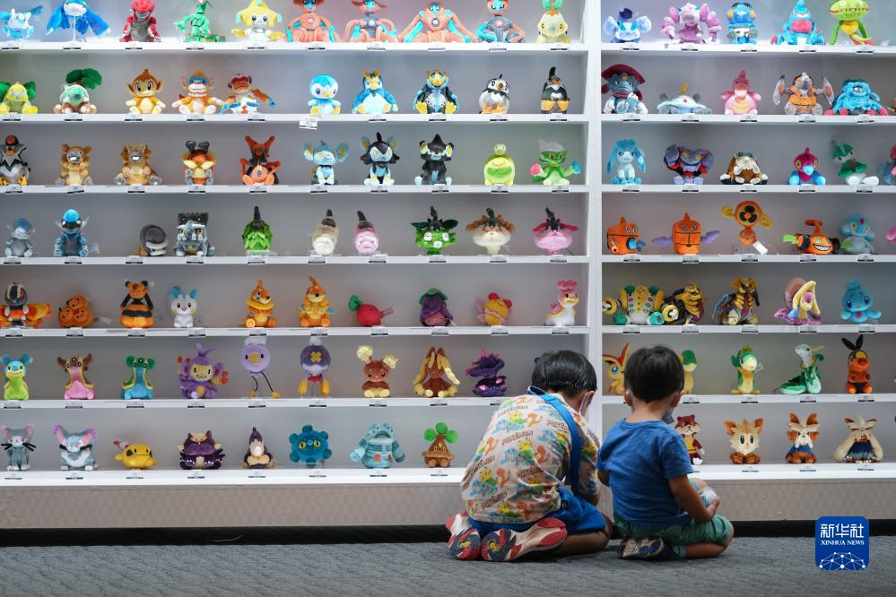 8月13日,兩個小孩在日本橫濱未來港寶可夢商店展示柜前玩耍。