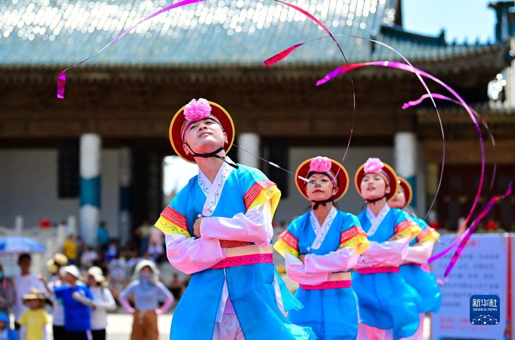 8月13日,在鄂爾多斯文化產業園景區,非遺傳承人表演朝鮮族象帽舞。