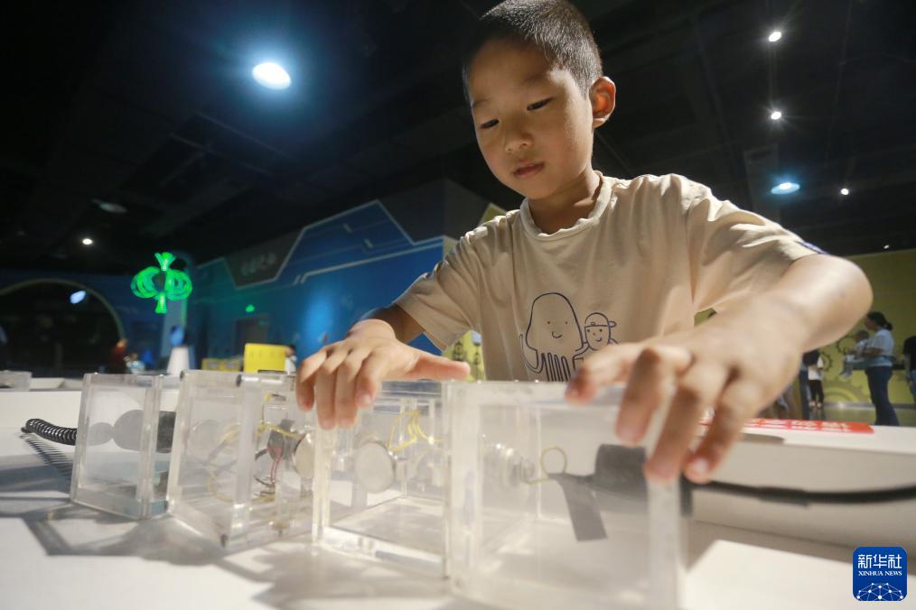 8月13日, 小朋友在江蘇揚(yáng)州科技館體驗(yàn)“電路游戲”。