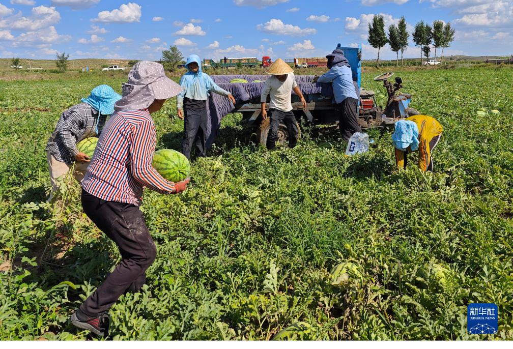 8月12日,內蒙古烏審旗無定河鎮河南村農民在采摘西瓜。