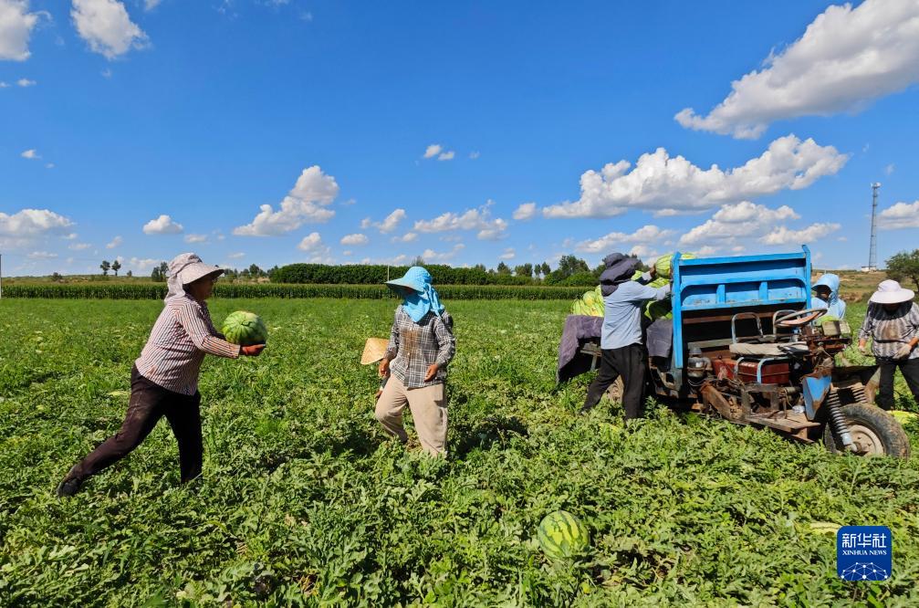 8月12日,內蒙古烏審旗無定河鎮河南村農民在采摘西瓜。