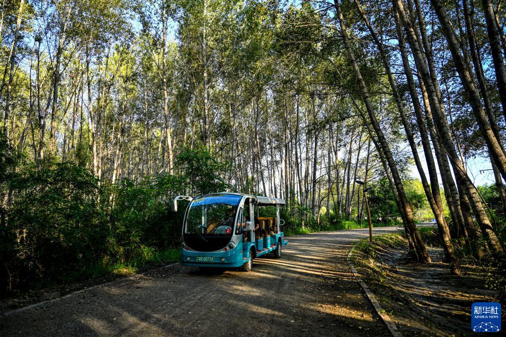8月13日,游人乘坐電瓶車欣賞洮兒河國家濕地公園景色。