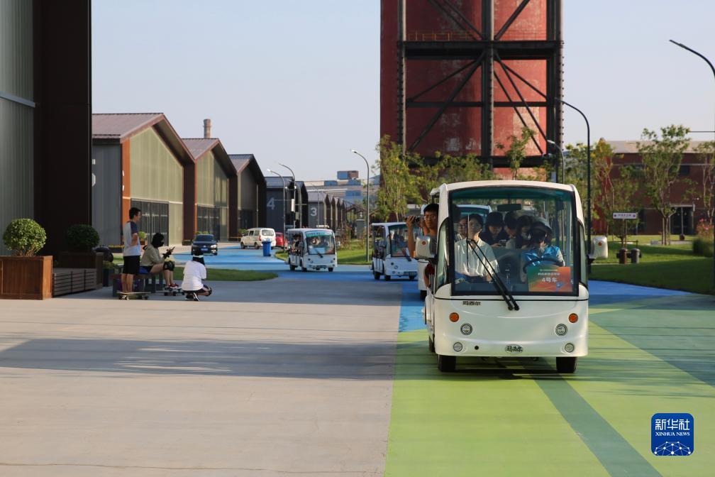 8月13日,媒體記者在首鋼園區乘車參加場館探營活動。