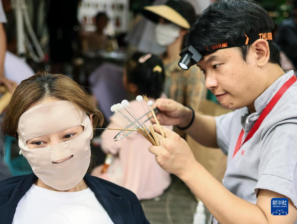 一位戴著“臉基尼”的女顧客在享受采耳服務(7月31日攝)。