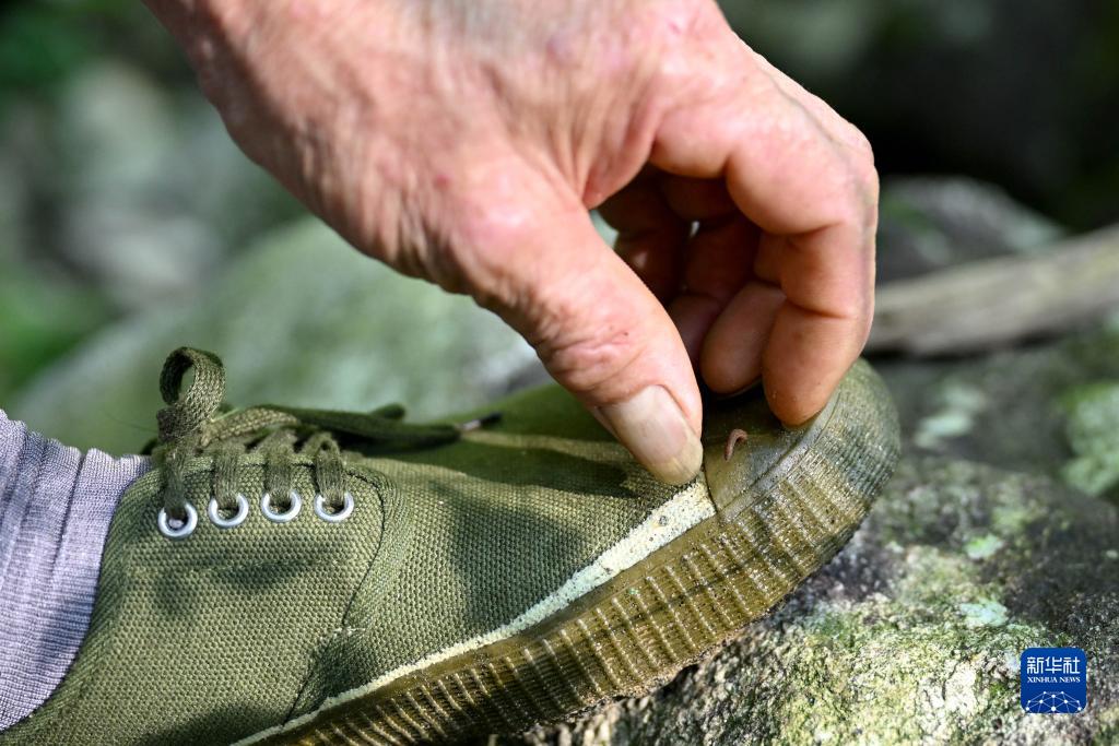 8月12日,在安徽天馬國家級自然保護區天堂寨管理站,王克東在巡山護林途中用手拿掉爬到鞋上的螞蟥。
