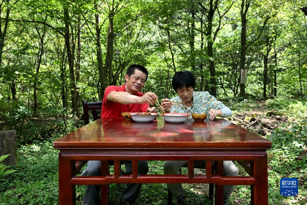 8月12日,在安徽天馬國家級自然保護區(qū)天堂寨管理站的一處管護站,王克東和高開玉在吃飯。每年10月1日至次年4月30日的防火關鍵期,王克東夫妻倆會在這里長期居住。