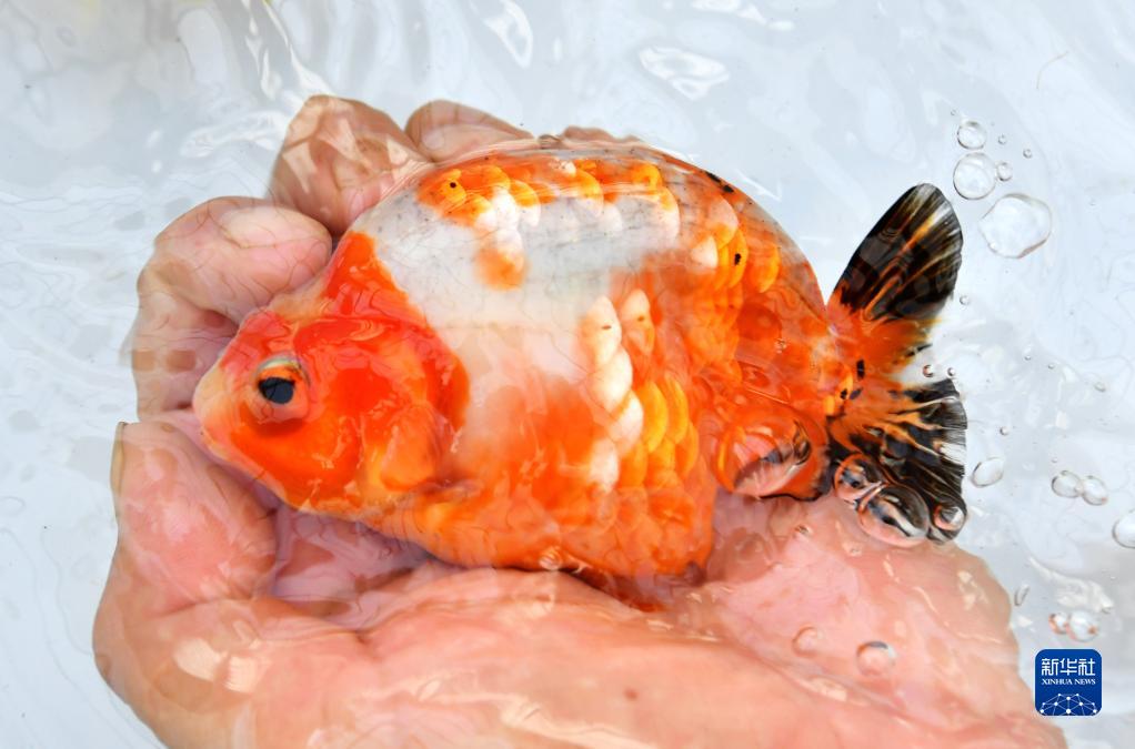 在福州市閩侯縣南通鎮(zhèn)古城村春園鯉生態(tài)養(yǎng)殖場,養(yǎng)殖戶向記者展示他們養(yǎng)殖的福壽品種金魚(8月9日攝 )。福壽是福州蘭壽金魚的簡稱,經(jīng)過幾代人改良的福州蘭壽,多次在全國各類金魚大賽中奪冠。