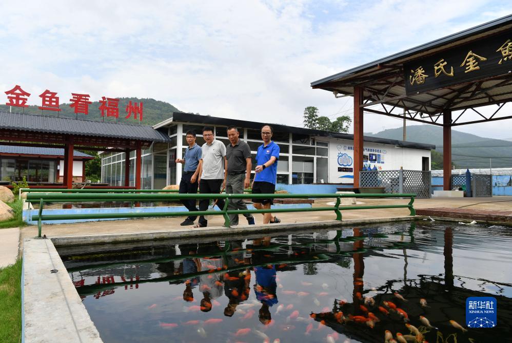 這是在福州市閩侯縣荊溪鎮關中村潘氏金魚養殖基地,科技特派員團隊與養殖場負責人潘國誠(右二)在養殖場(8月11日攝)。