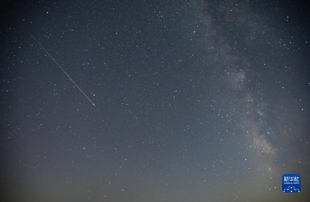 在四川省三臺縣魯班鎮,英仙座流星雨劃過夜空(8月14日攝)。