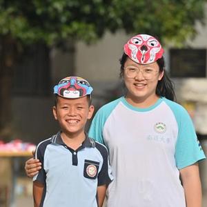 在廣西融安縣泗頂鎮中心小學,廣西科技大學學生和小學生們合影(7月18日攝)。