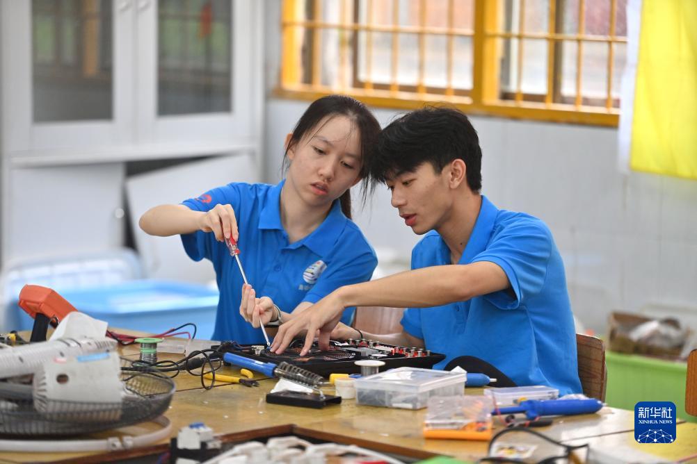 在廣西融安縣泗頂鎮(zhèn)中心小學(xué),廣西科技大學(xué)學(xué)生黃棟愉(左)和同學(xué)在給附近村民維修家電(7月18日攝)。