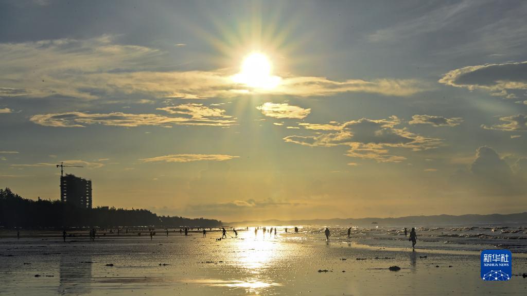8月14日,日出時分,游客在金灘游玩。