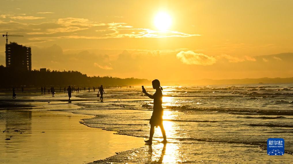 8月14日,游客在金灘上欣賞日出時的朝霞。