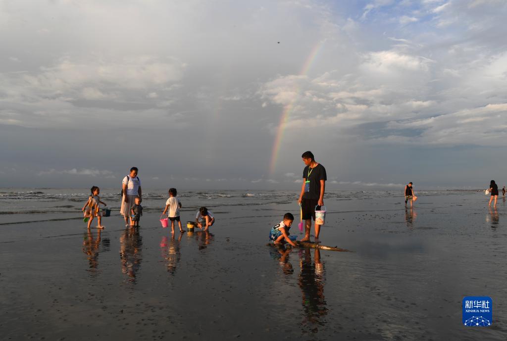 8月14日,游客在金灘出現的彩虹下游玩。
