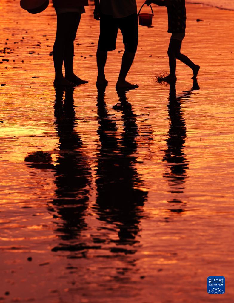 8月14日,游客在金灘上欣賞日出時的朝霞。