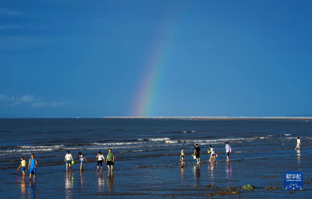 8月14日,游客在金灘出現(xiàn)的彩虹下游玩。