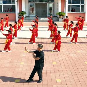 8月14日,在河北省滄州市滄縣汪家鋪鎮董辛莊小學,老師帶領學生習練武術(無人機照片)。