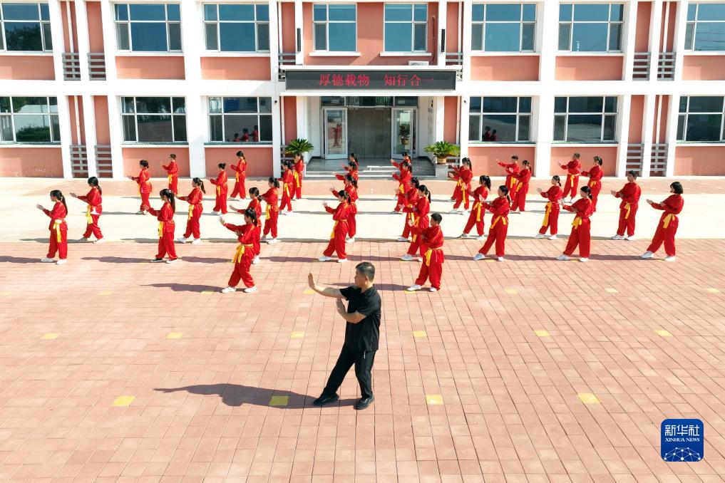 8月14日,在河北省滄州市滄縣汪家鋪鎮董辛莊小學,老師帶領學生習練武術(無人機照片)。