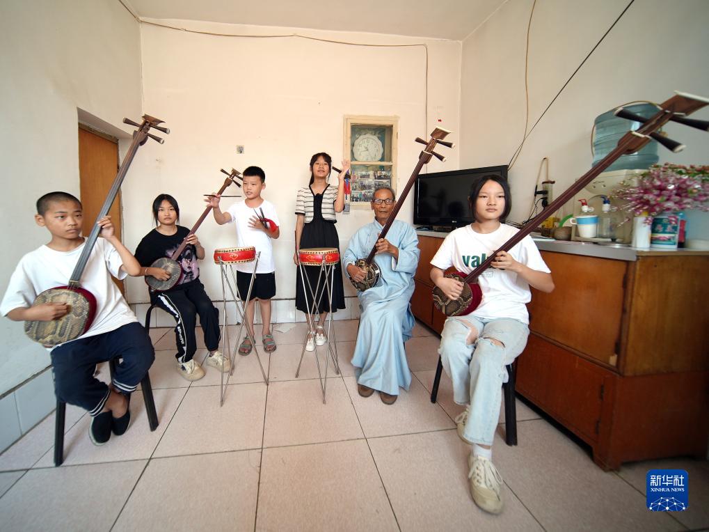 8月14日,在河北省滄州市滄縣舊州鎮后曹莊村,“滄州木板大鼓”國家級非遺傳承人劉銀河(右二)指導學生學習木板大鼓。