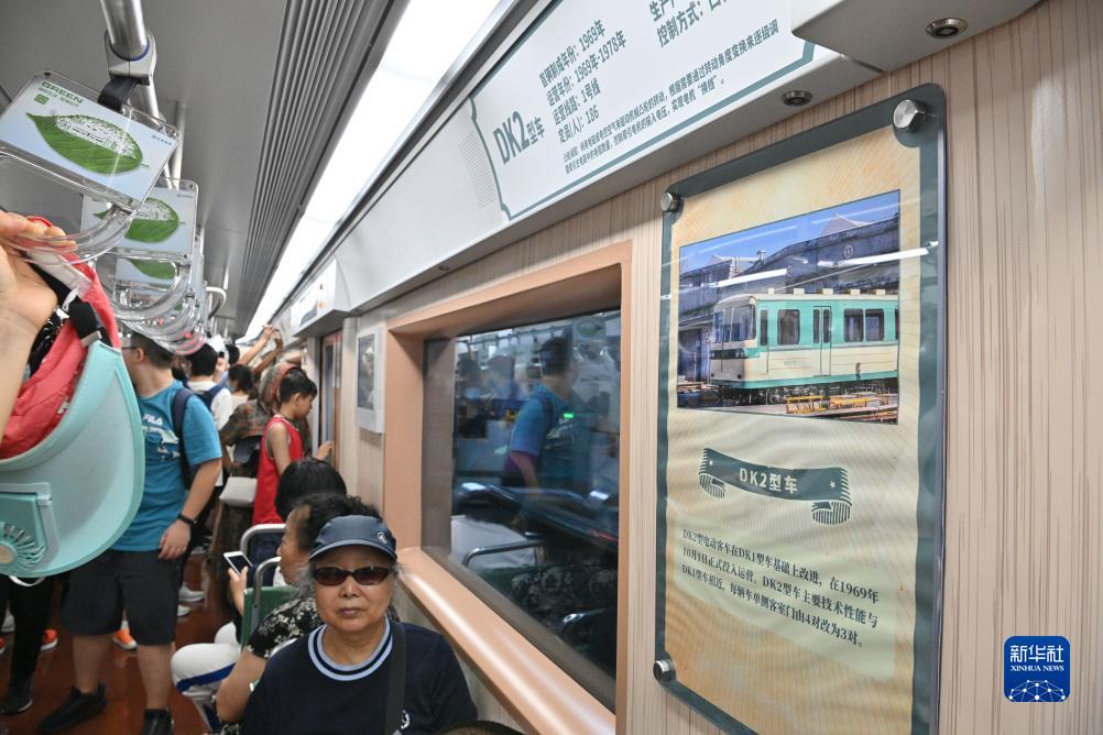 8月14日拍攝的北京地鐵一號線“時光列車”車廂內(nèi)展示的DK2型車介紹材料。