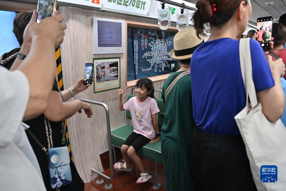 8月14日,乘客在北京地鐵一號線“時光列車”上拍照留念。