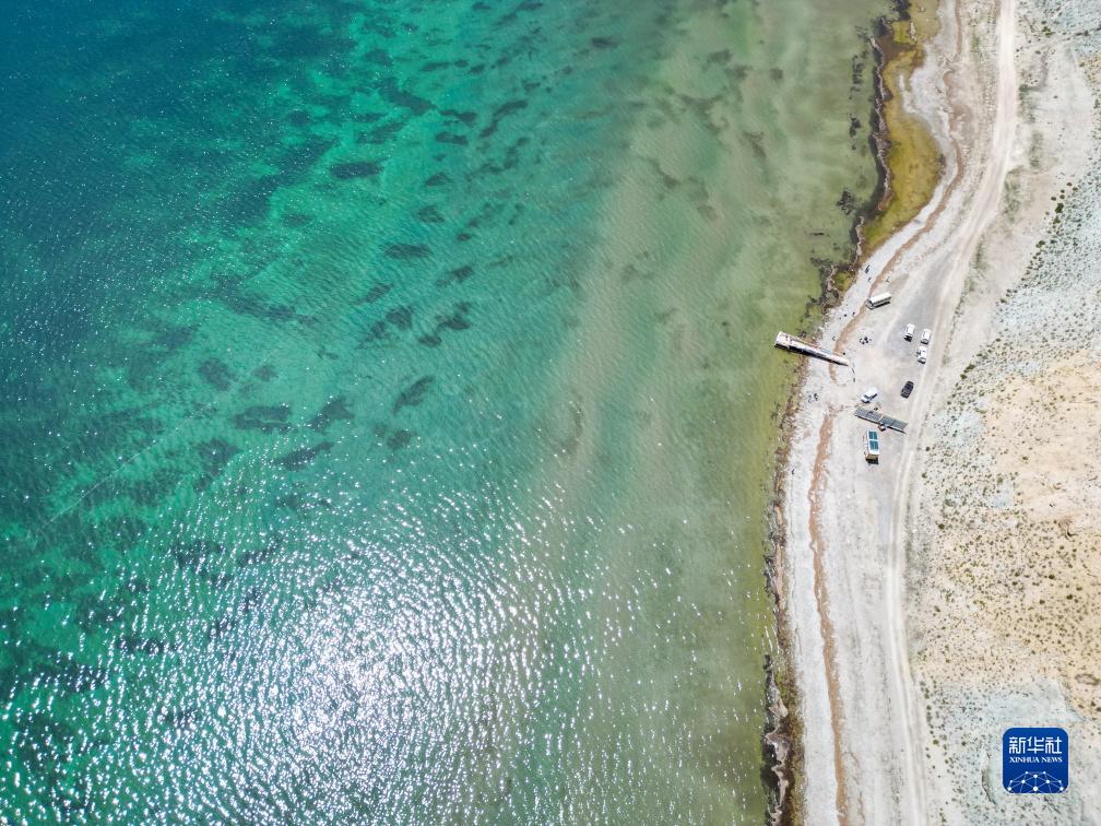 鳥瞰秋日瑪旁雍錯(無人機照片,8月13日攝)。