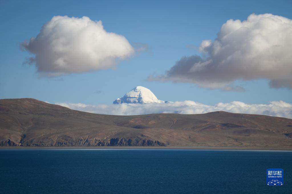 岡仁波齊峰和湖水交相輝映(8月13日攝)。