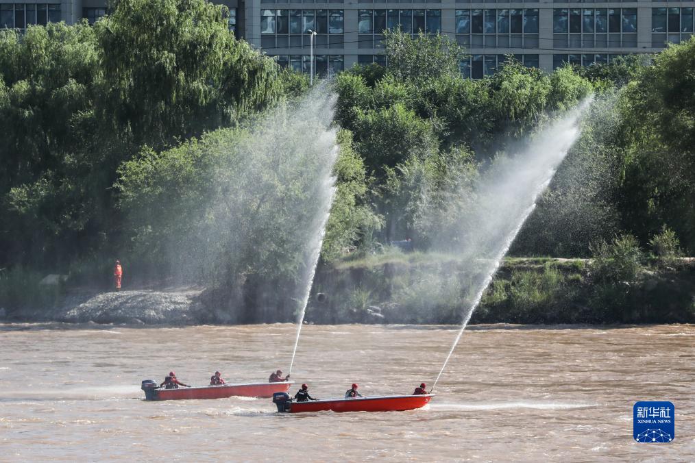 當(dāng)日,甘肅省防汛抗旱指揮部在黃河蘭州段開展“藍(lán)焰逐浪·2023”水域救援實(shí)戰(zhàn)化演練。演練模擬強(qiáng)降雨致河水上漲,群眾被困、落水漂流等情景,甘肅省消防救援總隊(duì)、甘肅省森林消防總隊(duì)和藍(lán)天救援隊(duì)等圍繞情景主線開展應(yīng)急救援演練。