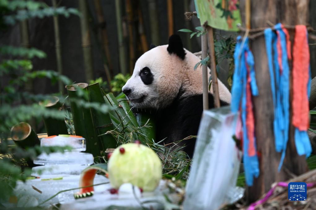 8月14日,在新加坡河川生態(tài)園,大熊貓“叻叻”在兩歲生日慶祝活動(dòng)上進(jìn)食。