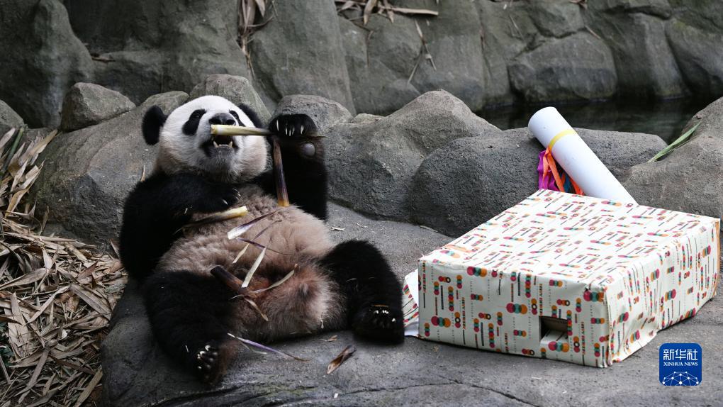 8月14日,在新加坡河川生態園,大熊貓“叻叻”在兩歲生日慶祝活動上進食。