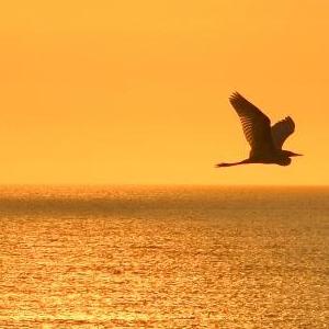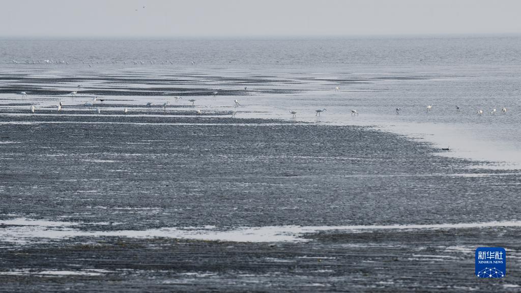 鳥兒在江蘇省啟東市圓陀角旅游度假區的灘涂覓食(2023年7月23日攝)。