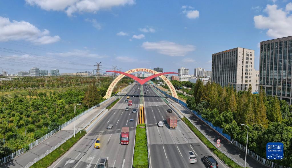 中國(上海)自由貿易試驗區保稅片區標志性景觀“海鷗門”(2022年10月17日攝,無人機照片)。