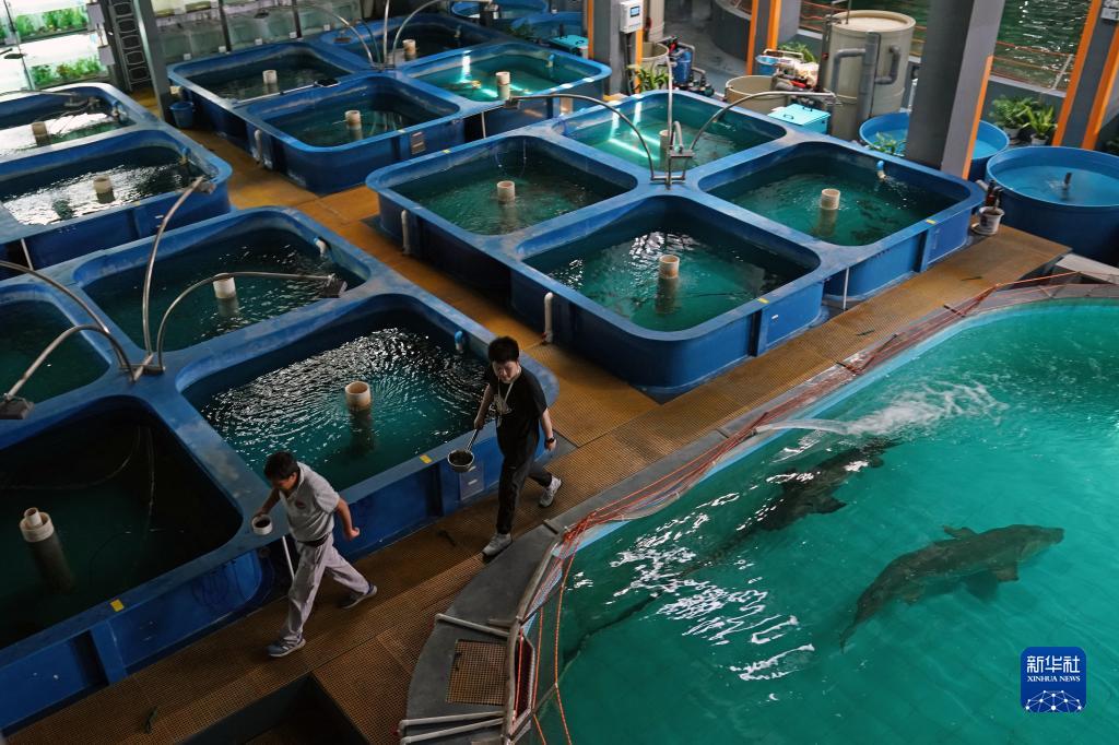 在位于崇明的長江口中華鱘自然保護區基地,工作人員在養殖車間內忙碌(2023年6月14日攝)。