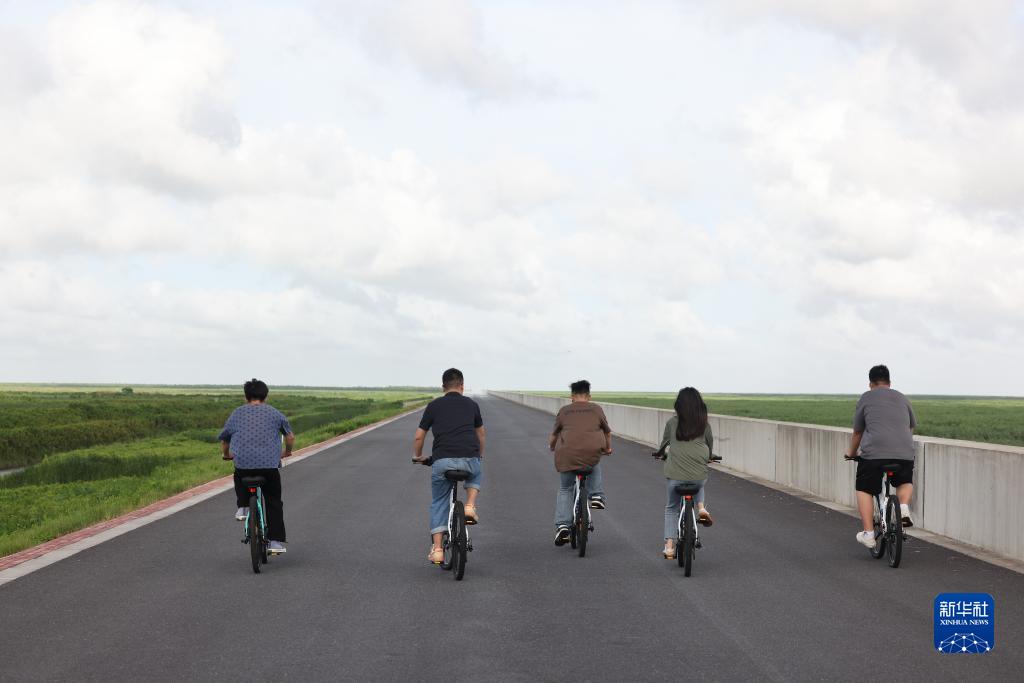游客在崇明橫沙島上騎行(2023年7月26日攝)。