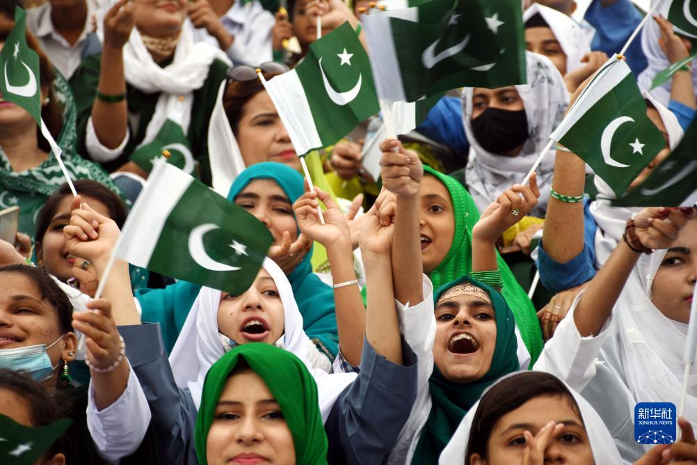 8月14日,在巴基斯坦卡拉奇,當(dāng)?shù)貙W(xué)生參加巴基斯坦獨(dú)立76周年慶祝活動(dòng)。