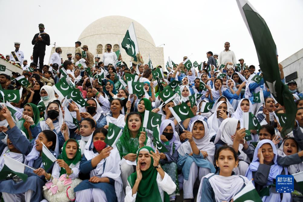 8月14日,在巴基斯坦卡拉奇,當(dāng)?shù)貙W(xué)生參加巴基斯坦獨立76周年慶祝活動。