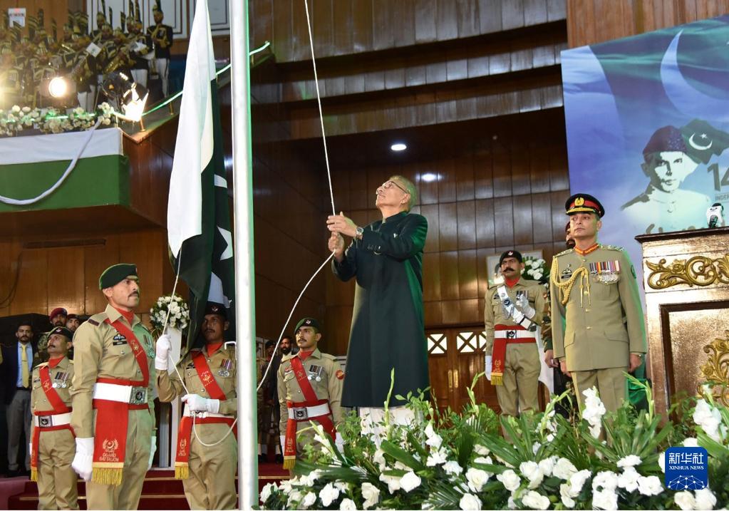 8月14日,在巴基斯坦首都伊斯蘭堡,巴基斯坦總統阿爾維在國家獨立76周年慶祝活動上升國旗。