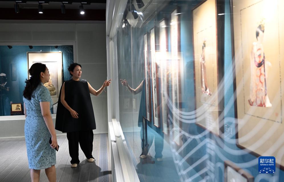 8月14日,北京服裝學院副教授沈華菊(右)向嘉賓介紹展出的蘇繡。