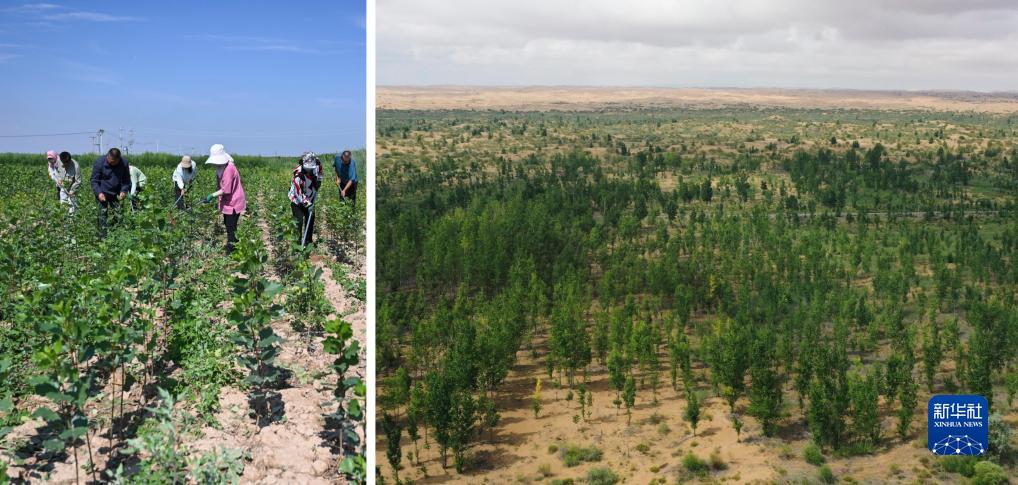 這是一張拼版照片。左圖為內(nèi)蒙古杭錦旗什拉召治沙站的工作人員在苗圃中除草(7月22日攝);右圖為內(nèi)蒙古杭錦旗什拉召治沙站種植的庫(kù)布其沙漠鎖邊林(7月22日攝,無(wú)人機(jī)照片)。20世紀(jì)50年代開始,國(guó)營(yíng)林場(chǎng)什拉召治沙站開始植樹治沙,三代治沙人在庫(kù)布其沙漠北緣營(yíng)造了長(zhǎng)48公里、面積12萬(wàn)多畝的鎖邊林帶,有效遏制了沙漠向北擴(kuò)張。