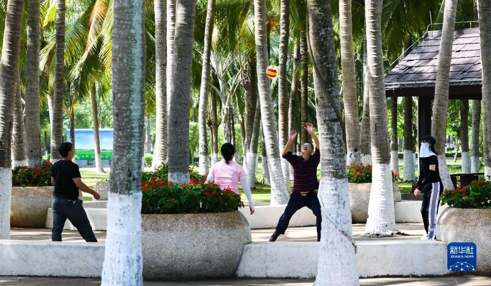 市民在海口市萬綠園內打排球(2022年4月5日攝)。