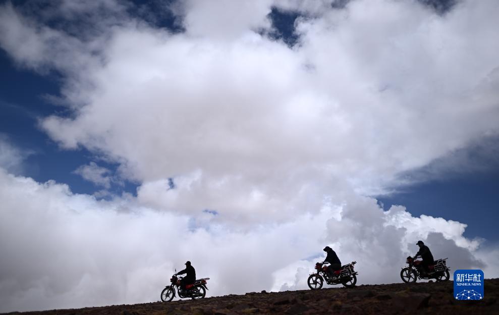 可可西里管理處卓乃湖保護站隊員在卓乃湖附近騎行巡護(6月17日攝)。