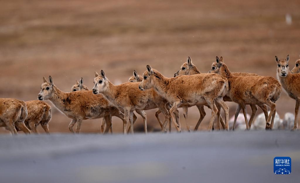 一群待產雌性藏羚羊在通過青藏公路前往可可西里卓乃湖產仔(5月28日攝)。