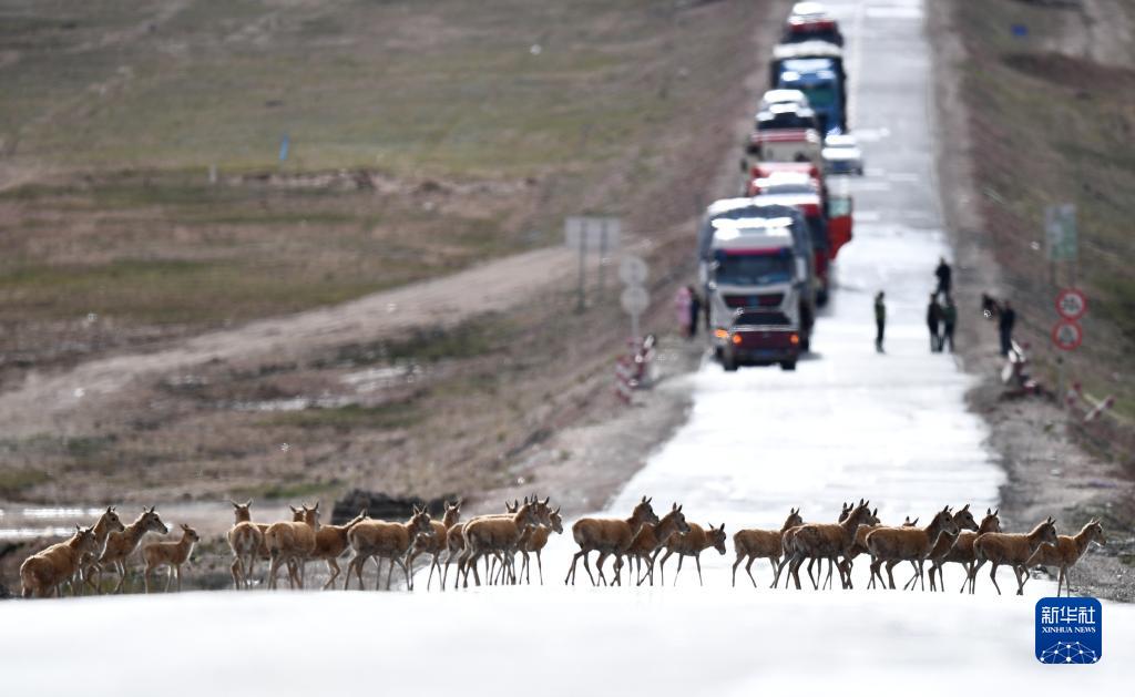 一群藏羚羊通過青藏公路前往青海三江源地區(qū)(7月28日攝)。