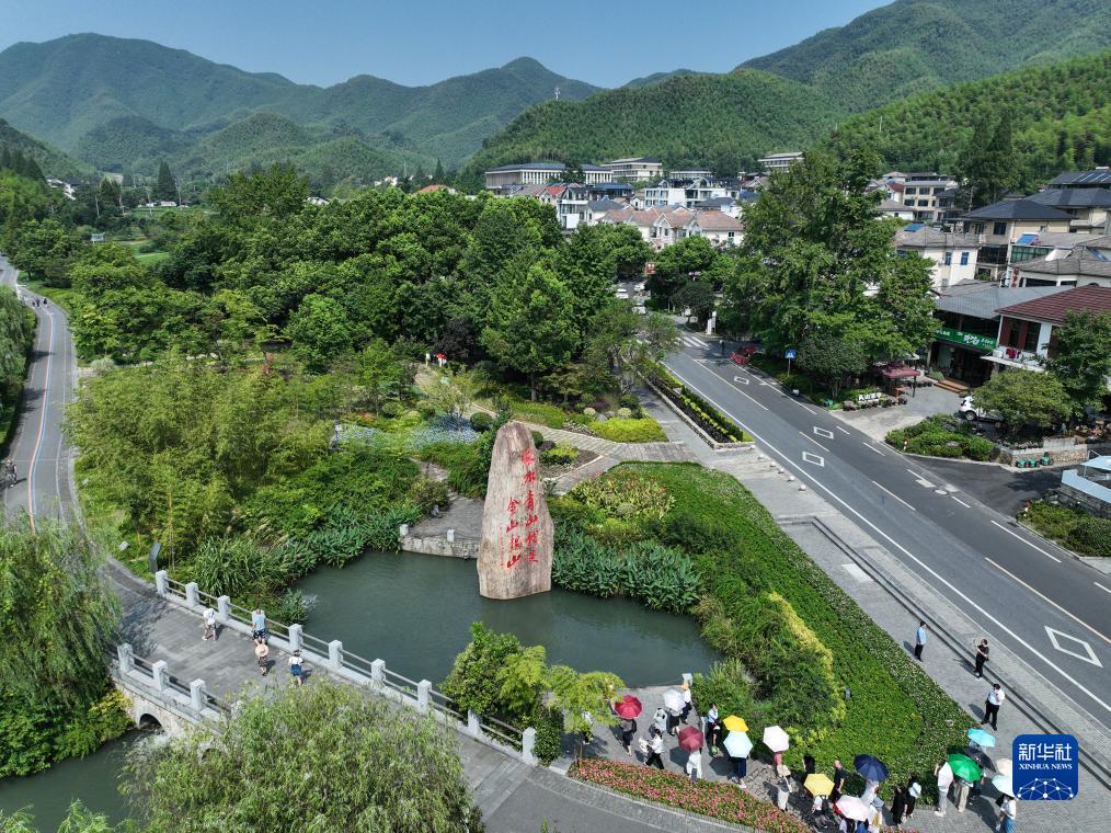游客在安吉余村參觀(8月11日攝,無人機照片)。