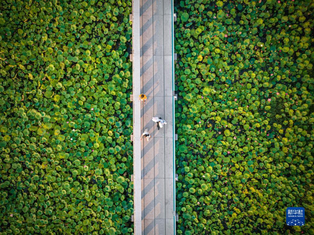 市民在杭州市上城區(qū)丁蘭街道桃花湖公園內(nèi)游玩(8月12日攝,無人機照片)。桃花湖公園占地300畝,是一個由工業(yè)園區(qū)改造成的復合型城市功能生態(tài)公園。