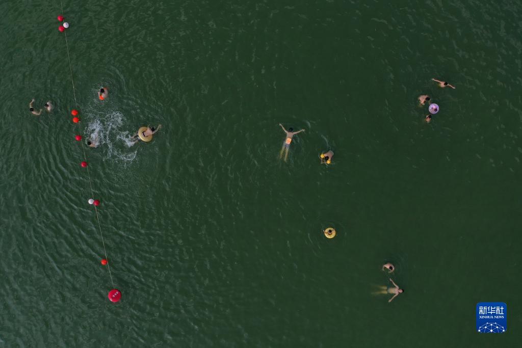 人們在流經(jīng)奉化區(qū)溪口鎮(zhèn)的剡江里游泳(8月11日攝,無人機照片)。