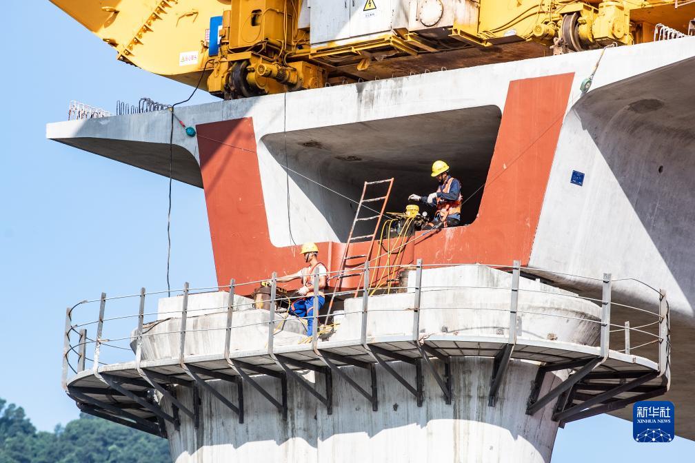 8月15日,在渝湘高鐵重慶段建設現場,施工人員在架橋機的幫助下進行首榀箱梁架設作業。