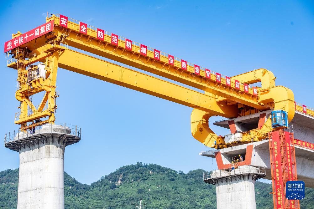 8月15日,在渝湘高鐵重慶段建設現場,施工人員在架橋機的幫助下進行首榀箱梁架設作業。