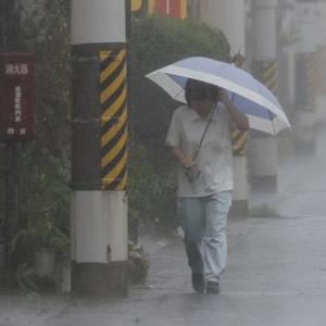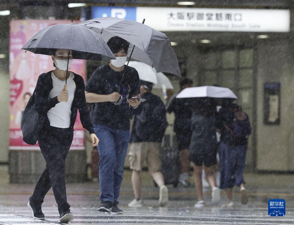 8月15日,人們在日本大阪府大阪市街頭冒雨出行。
