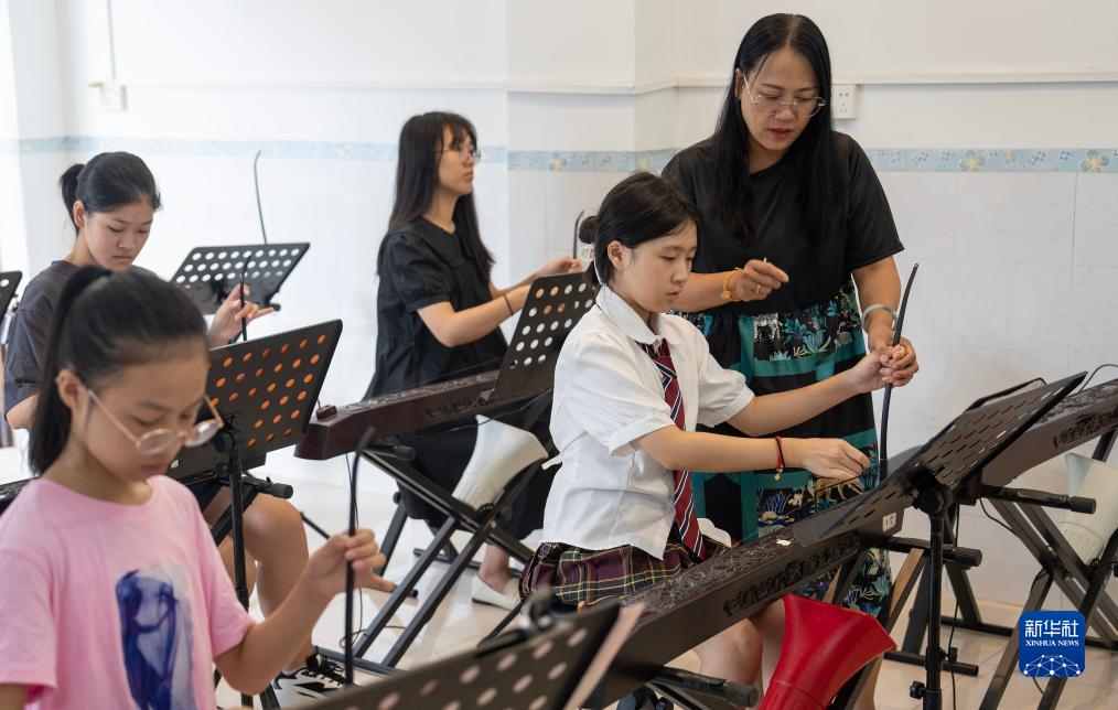 8月13日,東興京族博物館館長、獨弦琴傳承人蘇海珍(右一)在指導(dǎo)學(xué)生練習(xí)。